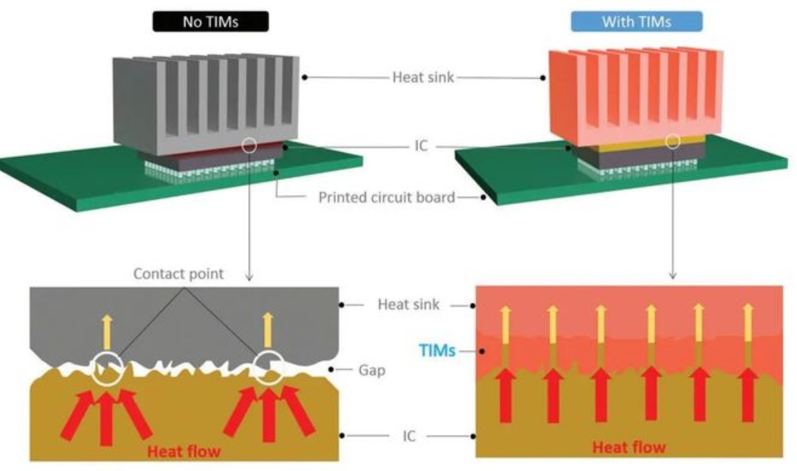研究表明,溫度每升高2°C,電子設備的性能就會下降10%。 為了確保電子裝置的長期、安全、可靠運行,研究和開發新型導熱材料已成為下一代電子裝置的首要任務。 設備與散熱器之間的傳熱在散熱過程中扮演決定性的角色。 在電子元件和散熱器之間引入具有高導熱性的複合材料對於解決這些散熱問題至關重要。 熱界面材料(TIMs)是用來改善電子設備熱傳遞的材料。 通常,TIMs放置在發熱晶片和/或元件與散熱基板或散熱器元件之間,如圖所示。