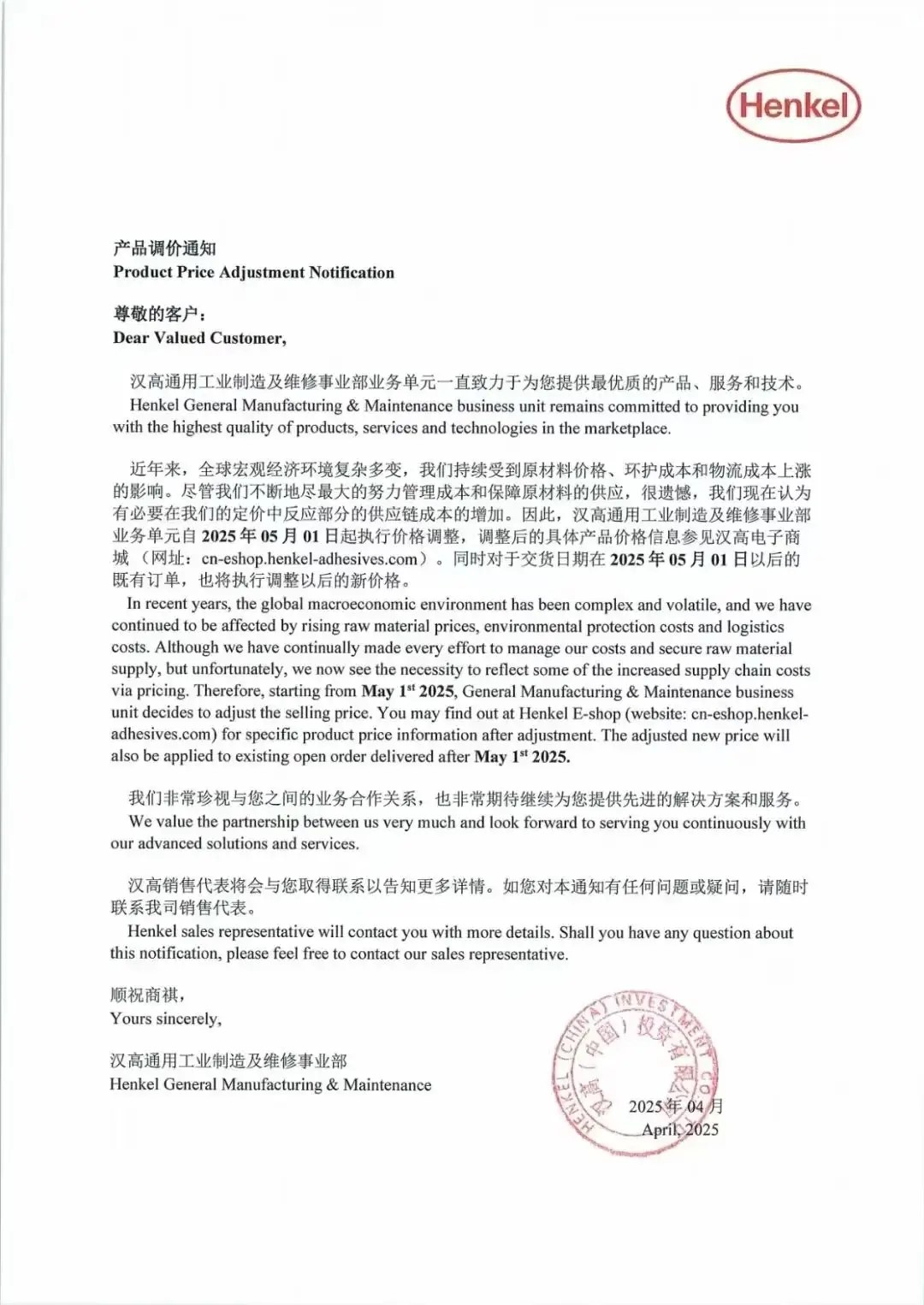 可能是面對關稅政策帶來的成本壓力,漢高集團宣布自2025年5月1日起調整產品價格,成為關稅風暴後膠合業首個公開漲價的企業。在其官方公告中,漢高直言漲價源於“原材料、環保及物流成本持續攀升”,並強調“既有訂單若交貨日期在5月1日後,也將執行新價格”。這項決定意味著,從汽車製造到電子設備組裝,依賴漢高黏合劑的下游企業將直面成本激增挑戰。