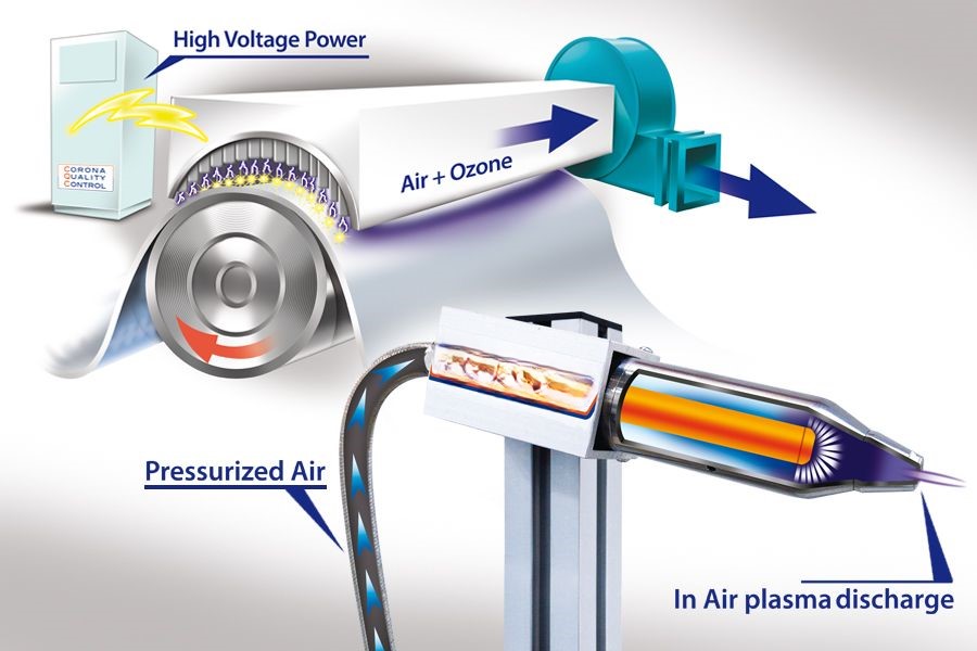 採用高頻高壓放電,使得塑膠表面被空氣中的氧氣部分氧化,產生羰基等極性基團。電暈處理法常與幾種表面處理方法結合,例如砂磨→腐蝕→清洗→乾燥。